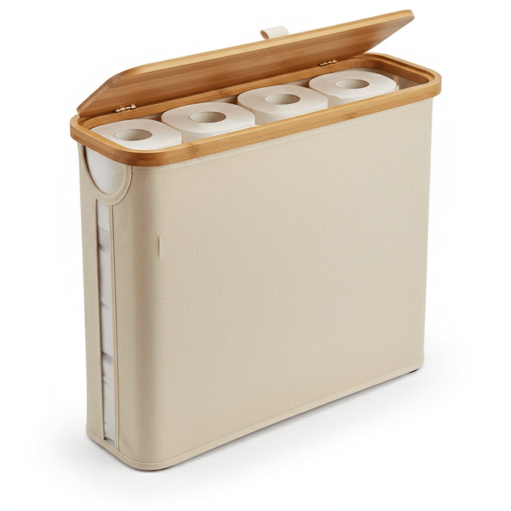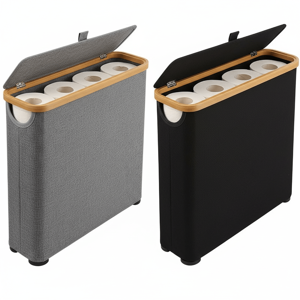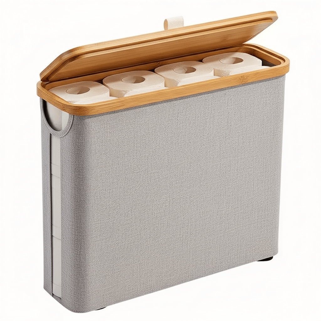 Keep your bathroom tidy without drilling holes. This foldable toilet paper holder stores up to 6 rolls in a sleek, space-saving design. Durable wood frame with gray fabric finish looks modern and blends with any bathroom decor. Perfect for small bathrooms, rentals, or anyone who wants organized storage without wall damage.